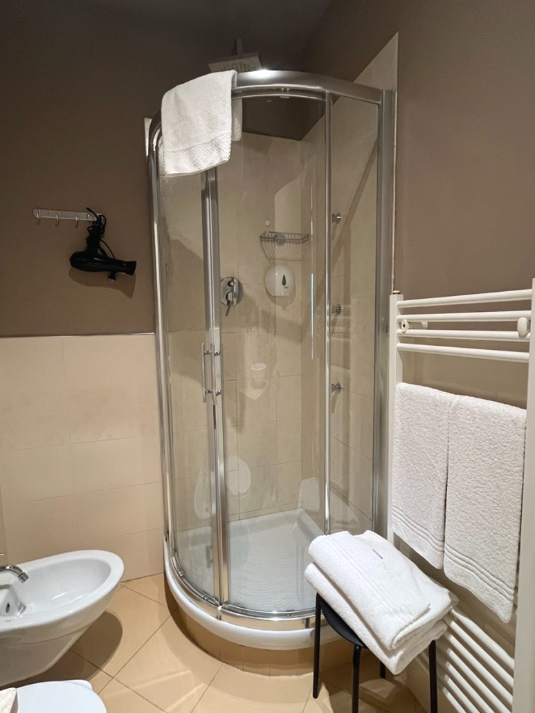 욕실의 샤워부스는 독특한 디자인으로 좁고 불편했어요. 무엇보다 석회수가 나오는 이탈리아에서 사용하려고 한국에서 샤워 필터를 가지고 왔었는데, 여기는 위와 옆에서 나오는 샤워시설이라 샤워필터를 사용할 수가 없었어요.. 석회수가 나온다는걸 이미 알고나니깐 씻기가 어려웠습니다. 이 부분이 상당히 별로였는데.. 저처럼 예민하신 분들은 다른 숙소를 고려하는 것이 좋겠습니다. 수건은 매일 교체되며, 냉장고의 음료는 유료이고 물은 무료로 제공됩니다.